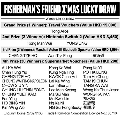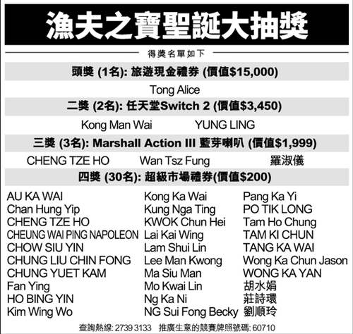 得獎名單將刊登於2025年12月24日之星島日報及The Standard