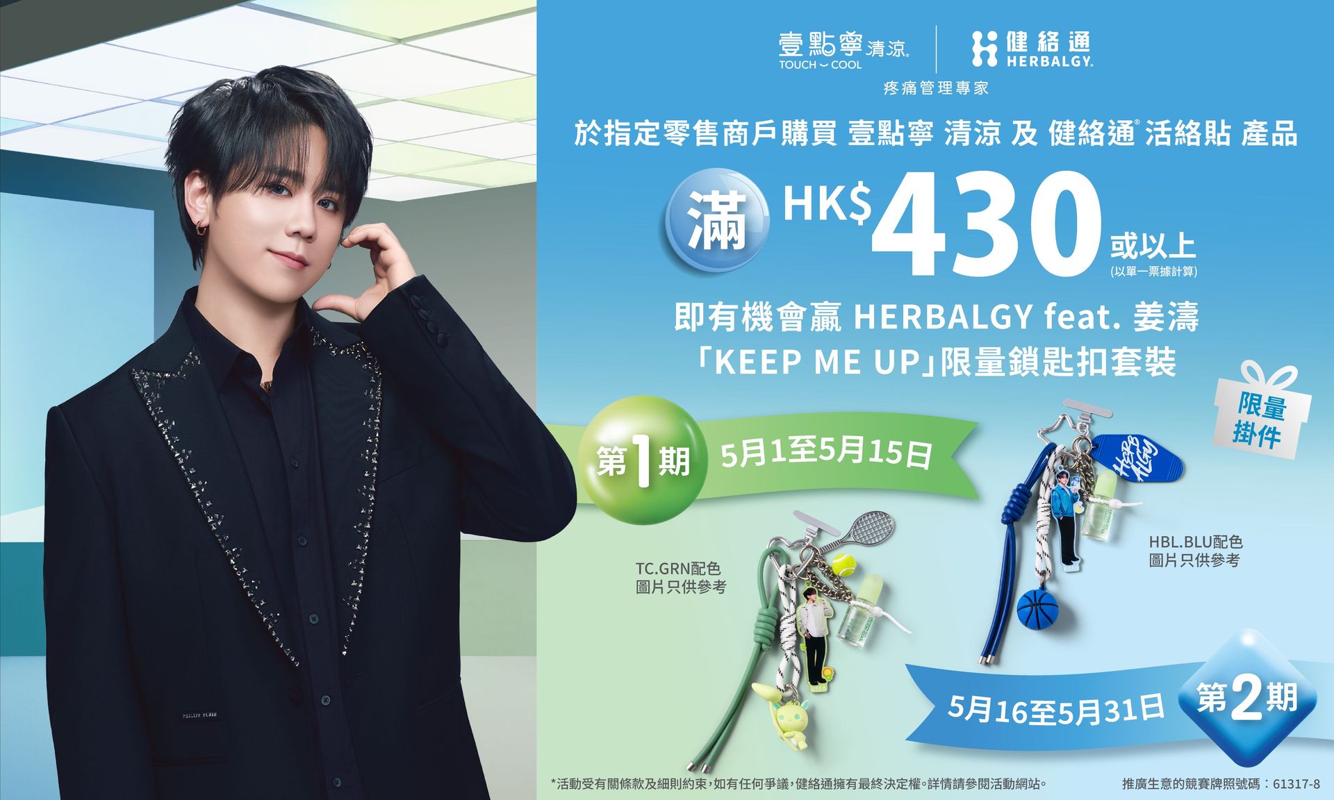 由2026年5月1日至2026年5月31日,於指定零售商戶購買(萬寧、屈臣氏、屈臣氏網店、松本清、裕華國貨、Colourmix、惠康、一田、AEON、龍豐集團、HKTVmall、健絡通官方網店) 壹點寧清涼及健絡通活絡貼產品滿HK$430或以上 (以單一票據計算),於指定網頁上傳清晰電腦收據相片,並提交收據編號、姓名、手提電話號碼、電郵地址及香港身份證號碼首4個數字,進行登記及抽籤,即有機會贏HERBALGY feat. 姜濤「KEEP ME UP」限量鎖匙扣及壹點寧清涼5ml 。